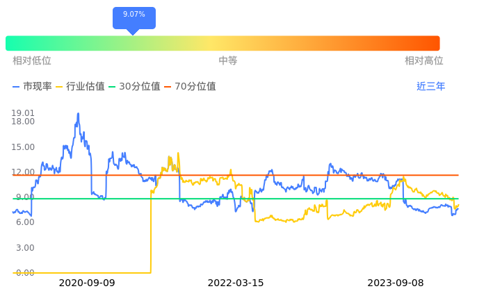2023年09月08日,中海油服下跌0.19%收于16.18,今日成交金额8329.52万元。下文将从市盈率PETTM、市净率PB、市现率3个角度去分析公司估值情况。