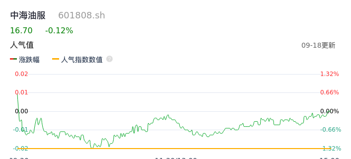 09月18日,中海油服收报16.70,股价涨幅-0.12%,成交金额1.05亿元,换手率0.21%。