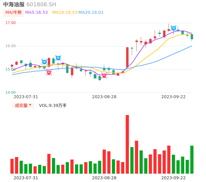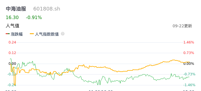 09月22日,中海油服收报16.30,股价涨幅-0.91%,成交金额1.53亿元,换手率0.32%。
