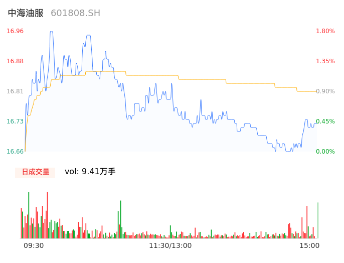 09月15日,中海油服收报16.72,股价涨幅0.36%,成交金额1.58亿元,换手率0.32%。