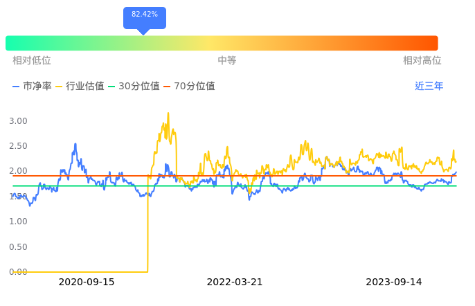 中海油服当前市净率PB为1.99,在所属的油服工程中,市净率PB排6,前五名分别为中油工程市净率0.84、海油工程市净率1.18、博迈科市净率1.19、海油发展市净率1.43、惠博普市净率1.92。中海油服当前市净率PB为1.99,超过近3年82.42%的历史数据。