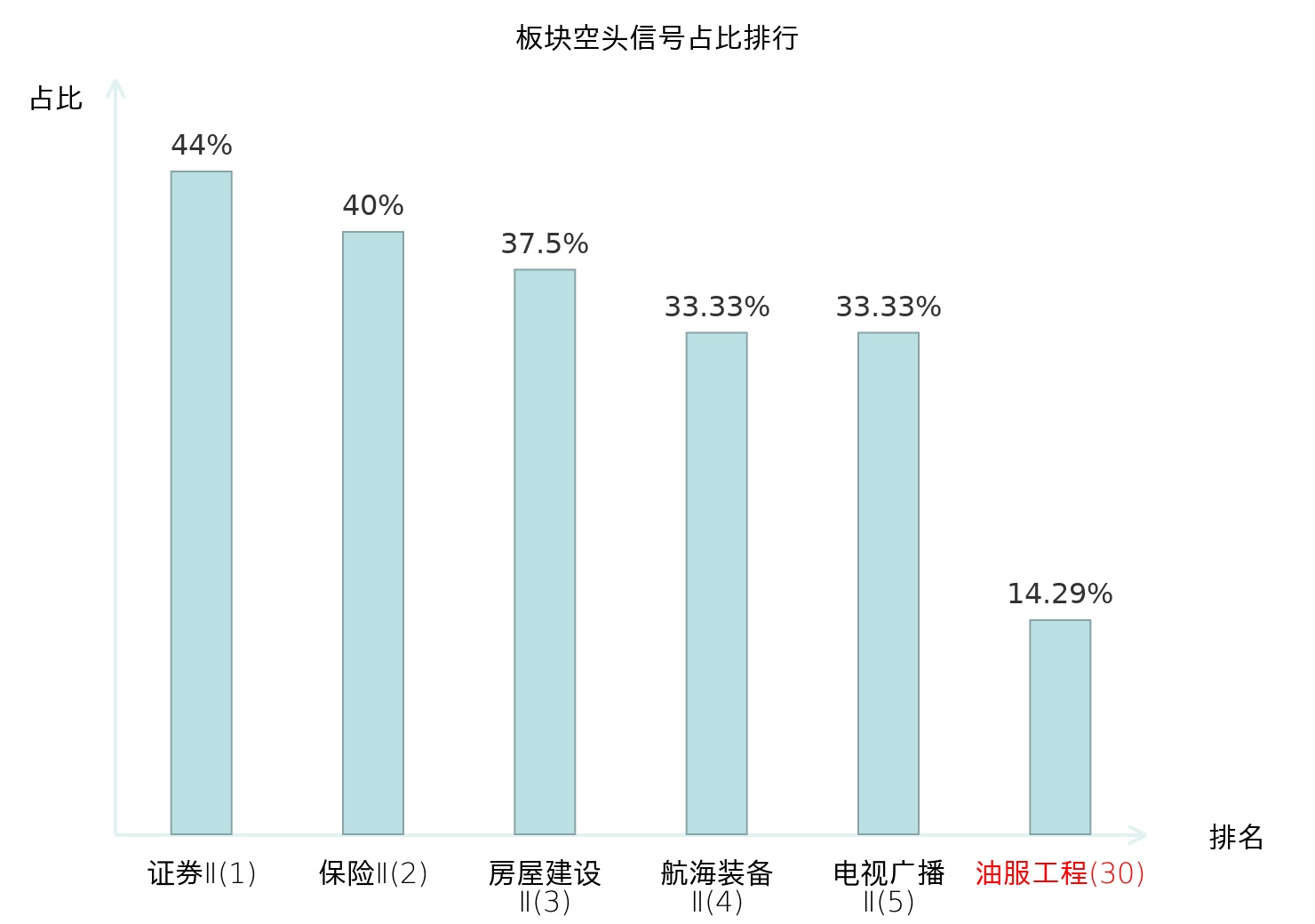 全市场所有行业板块中主力空头信号占比排名中,证券Ⅱ板块位居第一。证券Ⅱ板块名次提升最快,较昨日上升125位。