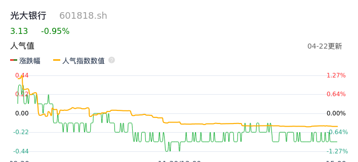 04月22日,光大银行收报3.13,股价涨幅-0.95%,成交金额5.62亿元,换手率0.38%。
