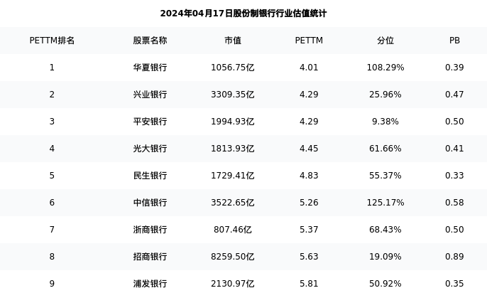 从估值角度看:光大银行最新市盈率PETTM为4.45,在行业内排名4/9,处于61.66分位。