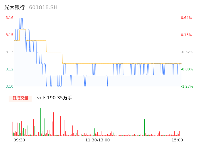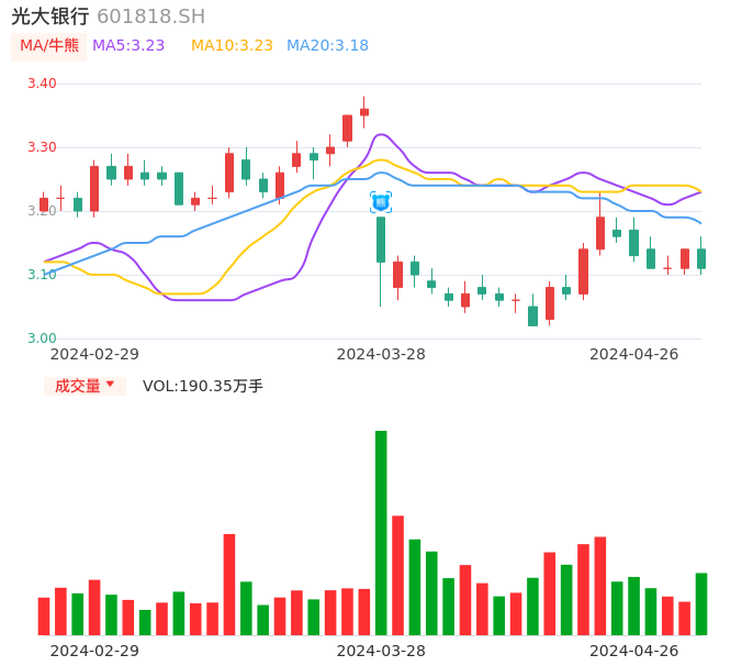 04月26日,光大银行收报3.11,股价涨幅-0.96%,成交金额5.94亿元,换手率0.41%。