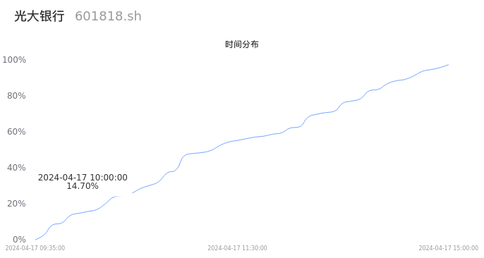 601818光大银行2024年04月17日成交278.75万手,成交金额8.67亿元,相较昨日放量62.83万手,换手率0.60%,成交清淡。