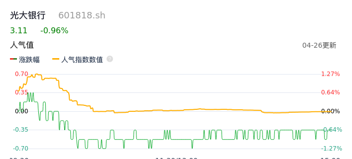 04月26日,光大银行收报3.11,股价涨幅-0.96%,成交金额5.94亿元,换手率0.41%。