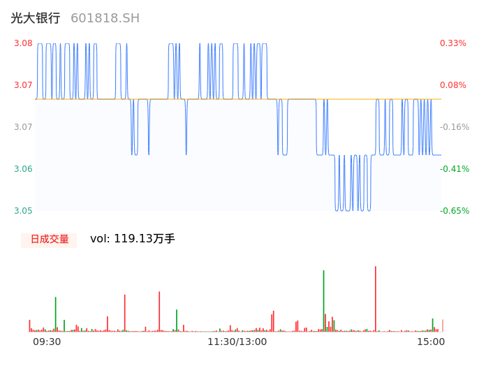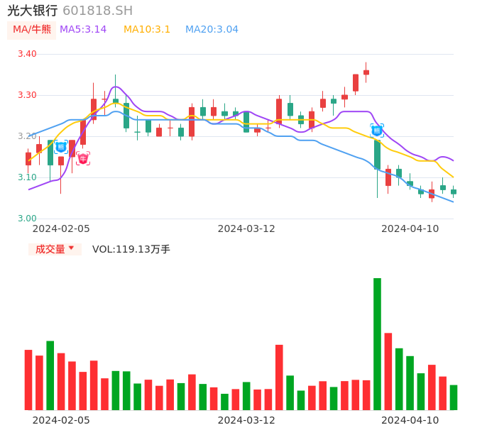 04月10日,光大银行收报3.06,股价涨幅-0.33%,成交金额3.65亿元,换手率0.26%。