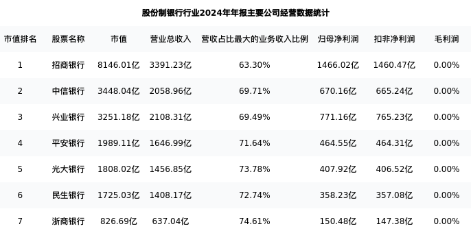 光大银行最新报告期数据为年报,下表汇总了股份制银行行业内市值靠前的公司年报主要经营数据