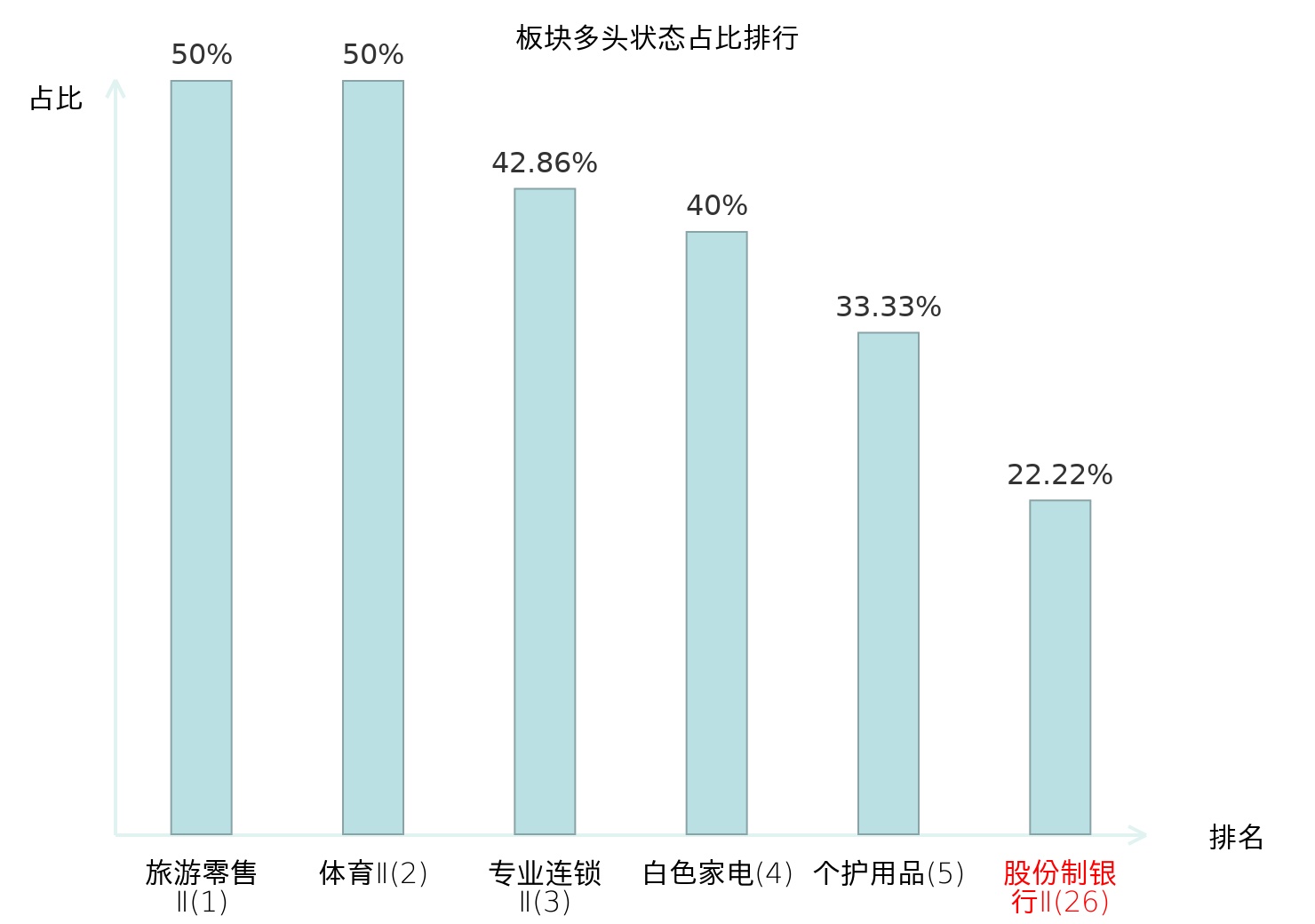 全市场所有行业板块中主力多头状态占比排名中,旅游零售Ⅱ板块位居第一。化学原料板块名次提升最快,较昨日上升35位。