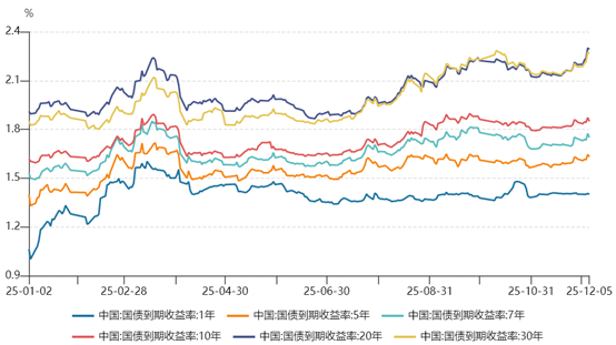 上周,超长端利率上行较多。截至12月5日收盘,1Y、5Y、7Y国债分别报收1.40%、1.63%、1.75%,分别较前一周收盘变动0BP、2BP、1BP;10Y、20Y、30Y国债分别报收1.85%、2.29%、2.27%,分别较上周收盘变动2BP、9BP、9BP。