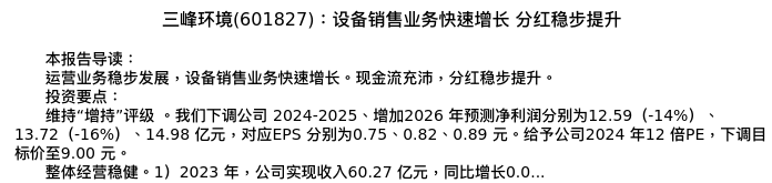值得注意的是:2024年04月国泰君安的徐强/邵潇/于歆分析师,首次发布关于三峰环境的研究报告,标题为:三峰环境(601827):设备销售业务快速增长 分红稳步提升。