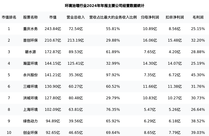 三峰环境最新报告期数据为年报,下表汇总了环境治理行业内市值靠前的公司年报主要经营数据