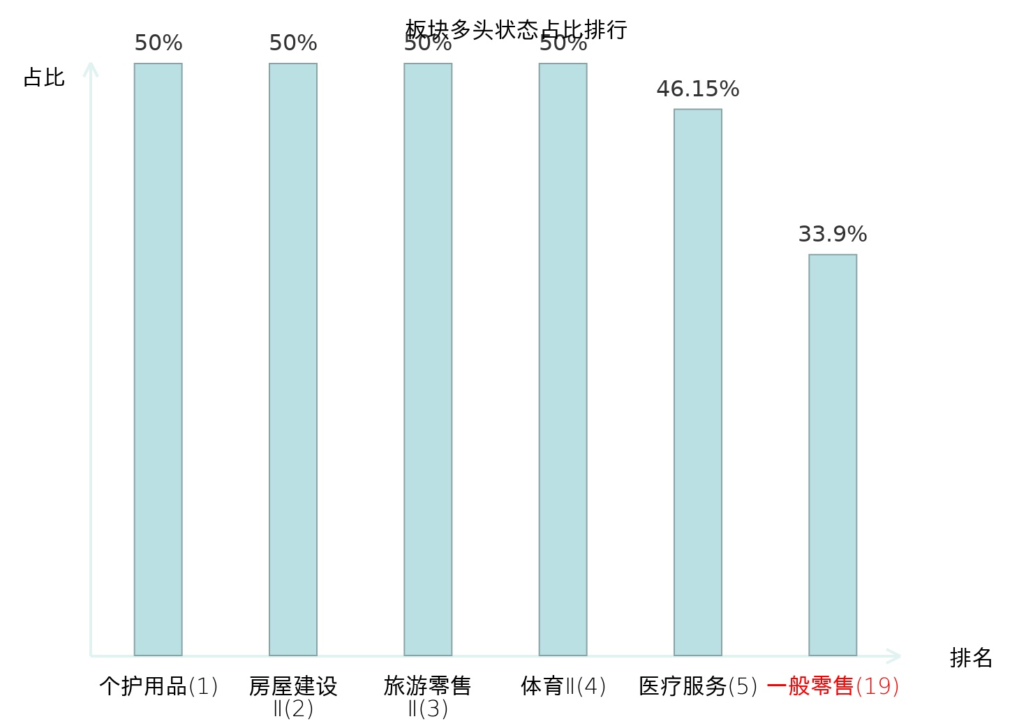 全市场所有行业板块中主力多头状态占比排名中,个护用品板块位居第一。影视院线板块名次提升最快,较昨日上升56位。