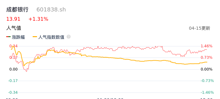 04月15日,成都银行收报13.91,股价涨幅1.31%,成交金额2.12亿元,换手率0.40%。