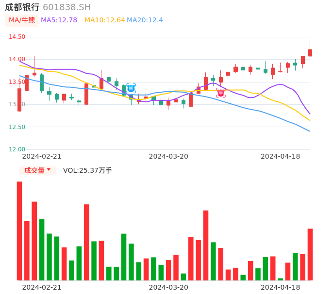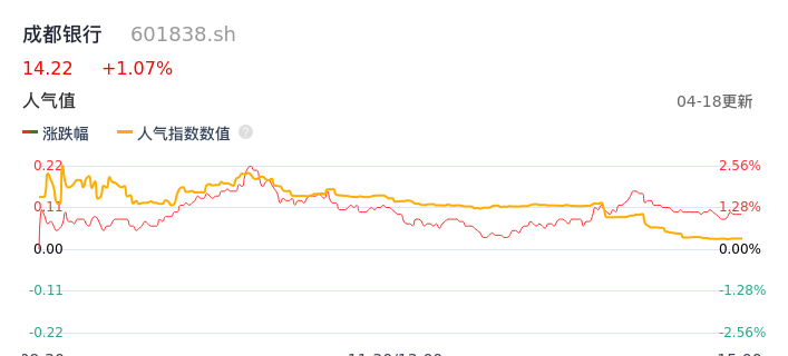 04月18日,成都银行收报14.22,股价涨幅1.07%,成交金额3.61亿元,换手率0.67%。