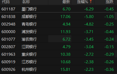 上证报中国证券网讯 10月29日早盘,银行板块震荡走低,截至9时54分,厦门银行跌超6%,成都银行跌超5%,青岛银行跌超4%,浦发银行、渝农商行、江阴银行等跌幅居前。
