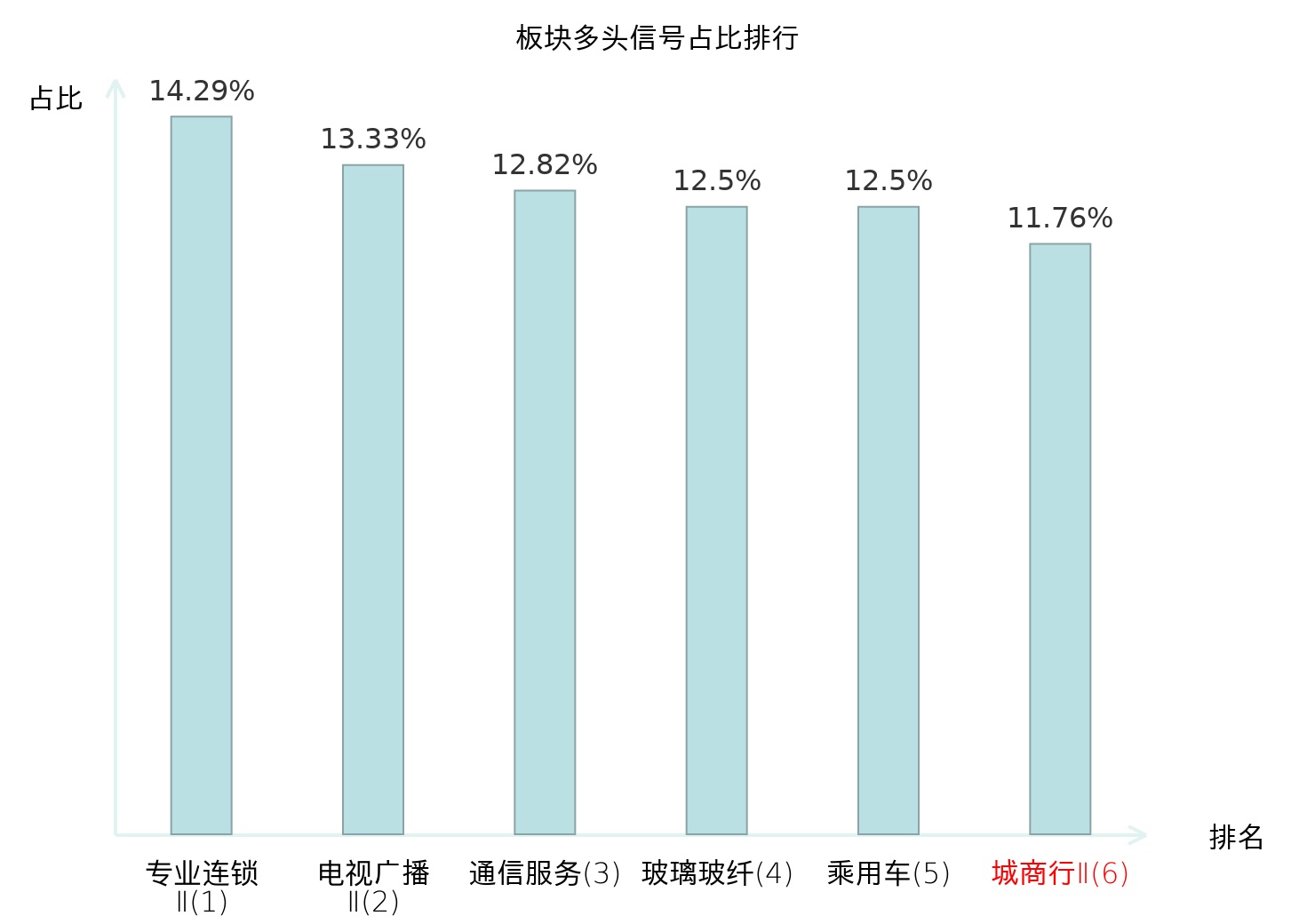 全市场所有行业板块中主力多头信号占比排名中,专业连锁Ⅱ板块位居第一。专业连锁Ⅱ板块名次提升最快,较昨日上升124位。