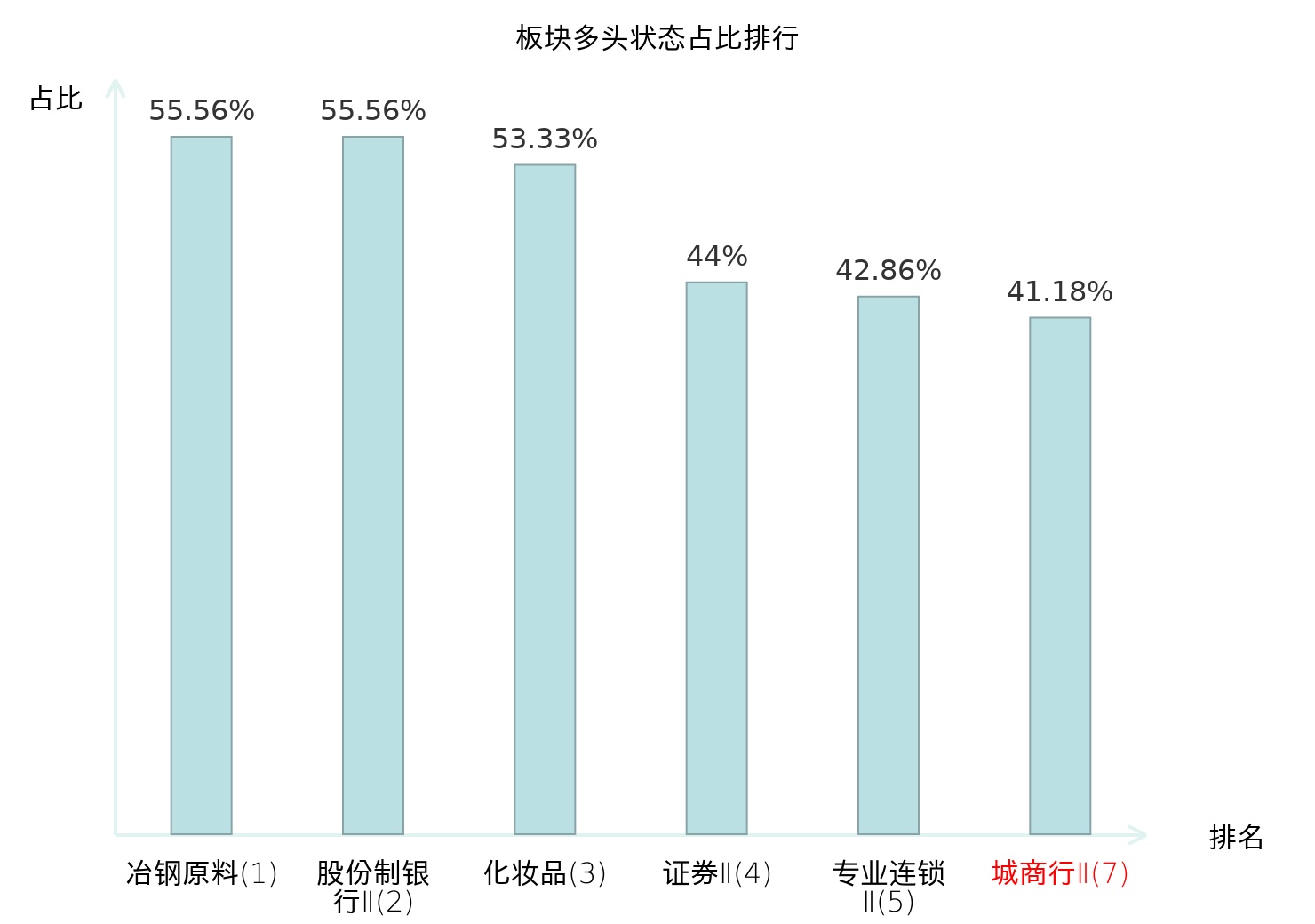 全市场所有行业板块中主力多头状态占比排名中,冶钢原料板块位居第一。保险Ⅱ板块名次提升最快,较昨日上升114位。
