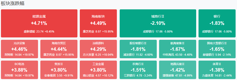板块方面,海南、光伏、有色金属等板块涨幅居前,银行、影视院线等板块跌幅居前。截至收盘,沪指涨0.7%,深成指涨1.95%,创业板指涨2.93%。