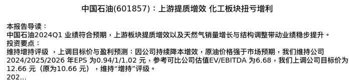值得注意的是:2024年05月国泰君安的孙羲昱/杨思远/陈浩越分析师,首次发布关于中国石油的研究报告,标题为:中国石油(601857):上游提质增效 化工板块扭亏增利。