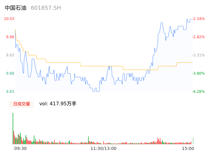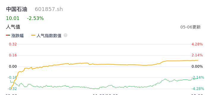 05月06日,中国石油收报10.01,股价涨幅-2.53%,成交金额41.42亿元,换手率0.26%。