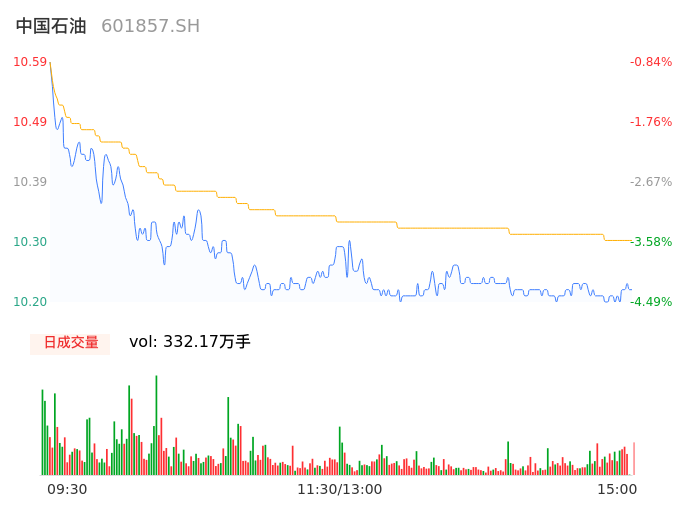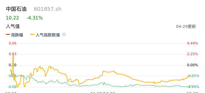 04月29日,中国石油收报10.22,股价涨幅-4.31%,成交金额34.21亿元,换手率0.21%。