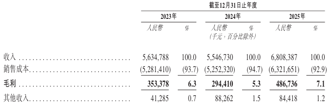 2023年、2024年、2025年,该公司毛利率分别为6.3%、5.3%、7.1%。
