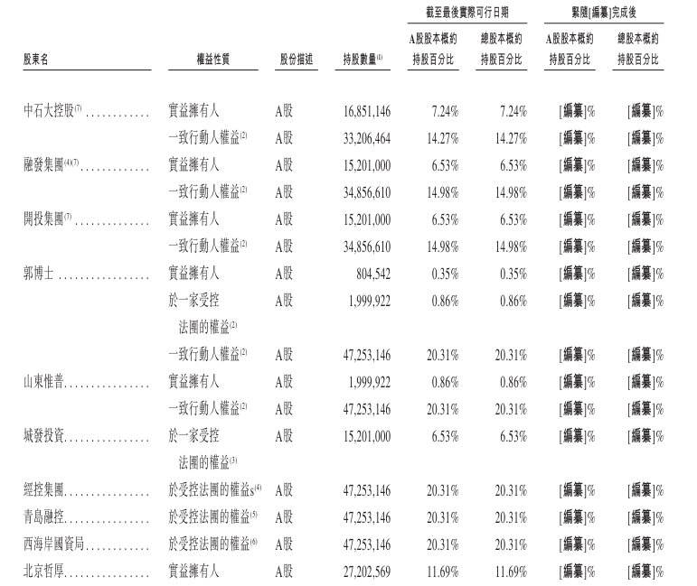根据香港上市规则及《新上市申请人指南》第1.1C章,中石大控股、融发集团、开投集团、郭博士及山东惟普为单一最大股东集团,截至最新实际可行日(2026年3月25日),持有约占该公司已发行股份总数的21.51%。