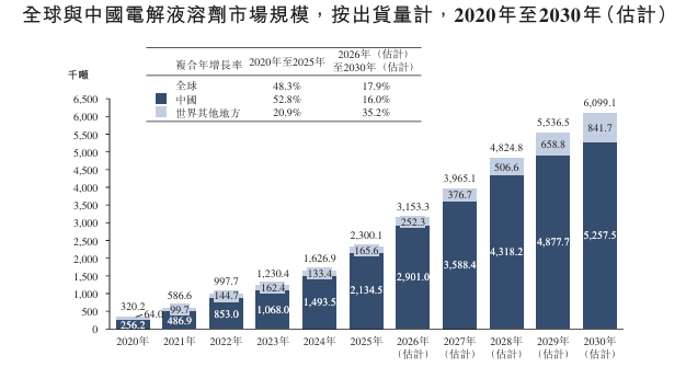 电解液作为锂电池核心材料,其需求随新能源产业扩张而增长。2020年至2025年,全球电解液出货量由327.6千吨增加至2,381.4千吨,复合年增长率为48.7%,预计到2030年该出货量将达到约6,380.6千吨。从区域视角来看,中国已成为全球电解液主要生产基地。2025年,中国电解液出货量达2,209.9千吨,占全球出货量比重90.0%以上,预计至2030年中国电解液出货量将达到5,500.1千吨。