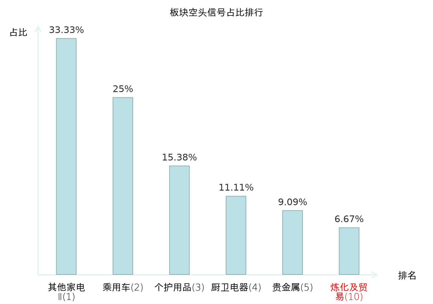 全市场所有行业板块中主力空头信号占比排名中,其他家电Ⅱ板块位居第一。个护用品板块名次提升最快,较昨日上升119位。