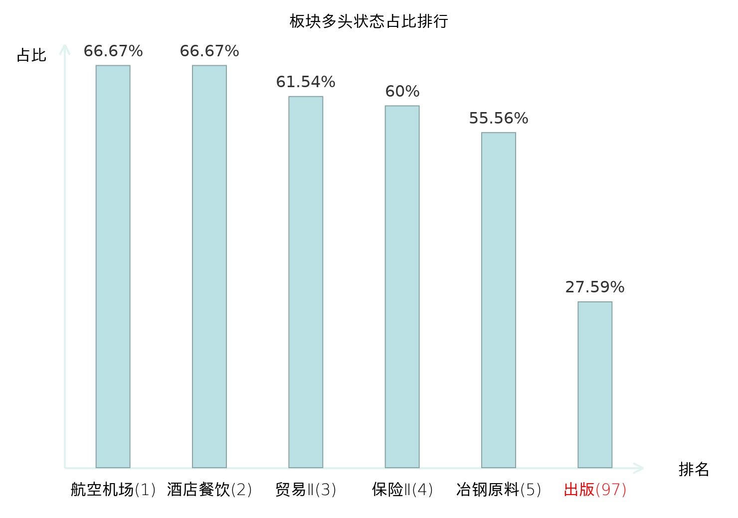 全市场所有行业板块中主力多头状态占比排名中,航空机场板块位居第一。农业综合Ⅱ板块名次提升最快,较昨日上升64位。