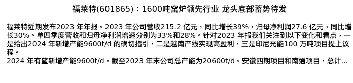 值得注意的是:2024年04月东方财富证券的周旭辉/朱晋潇分析师,首次发布关于福莱特的研究报告,标题为:福莱特(601865):1600吨窑炉领先行业 龙头底部蓄势待发。
