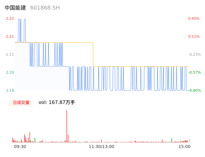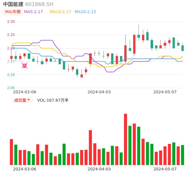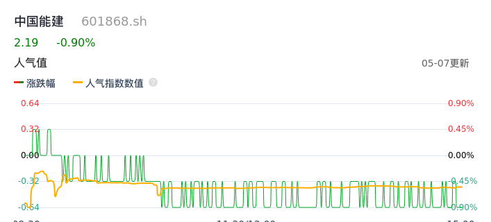 05月07日,中国能建收报2.19,股价涨幅-0.90%,成交金额3.69亿元,换手率1.18%。