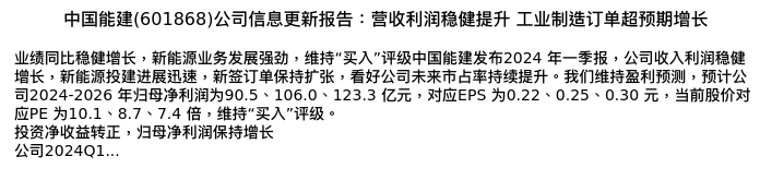 值得注意的是:2024年05月开源证券的齐东分析师,首次发布关于中国能建的研究报告,标题为:中国能建(601868)公司信息更新报告:营收利润稳健提升 工业制造订单超预期增长。