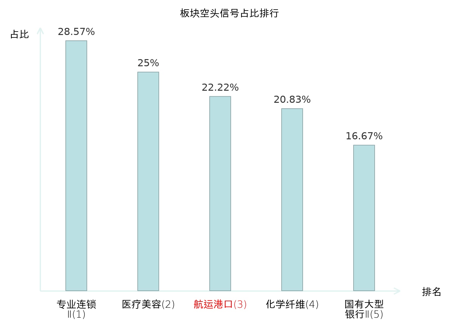全市场所有行业板块中主力空头信号占比排名中,专业连锁Ⅱ板块位居第一。食品加工板块名次提升最快,较昨日上升106位。