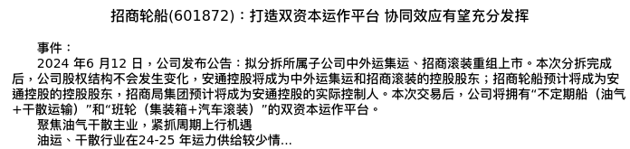 值得注意的是:2024年06月国联证券的李蔚分析师,首次发布关于招商轮船的研究报告,标题为:招商轮船(601872):打造双资本运作平台 协同效应有望充分发挥。