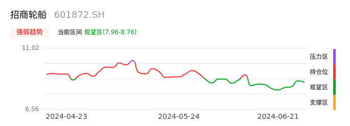 我们来看一下该股的九方特色指标强弱趋势的情况:招商轮船自06月11日从持仓区下穿到观望区,股价近期持续走弱。短期已经进入空头行情,且下跌动能仍未衰竭。建议继续谨慎观望。