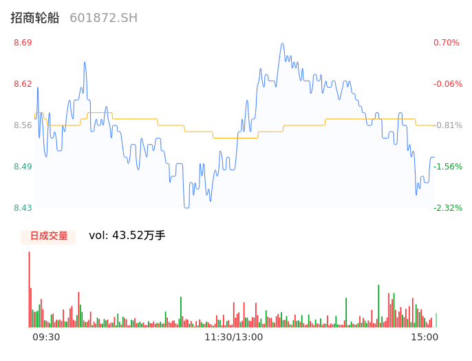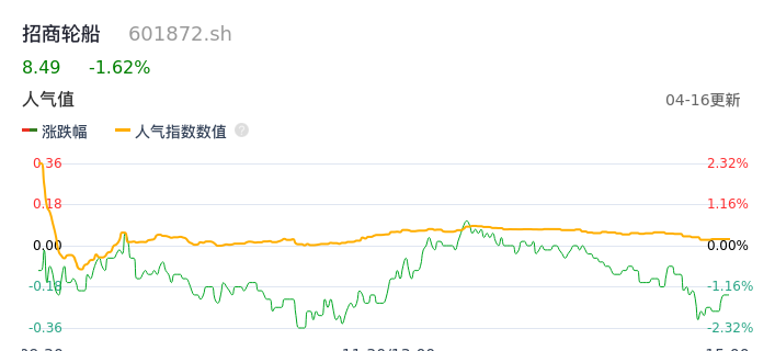 04月16日,招商轮船收报8.49,股价涨幅-1.62%,成交金额3.73亿元,换手率0.53%。