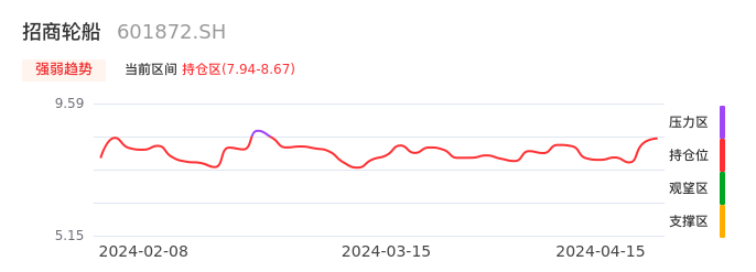 我们来看一下该股的九方特色指标强弱趋势的情况:招商轮船自03月05日从压力区回到持仓区。股价在持仓区盘整一段时间后,目前有启稳迹象。后续重点关注上方压力位:8.67元是否能重新上攻。