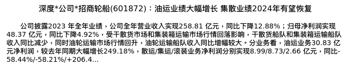 值得注意的是:2024年04月中银证券的王靖添分析师,首次发布关于招商轮船的研究报告,标题为:深度*公司*招商轮船(601872):油运业绩大幅增长 集散业绩2024年有望恢复。