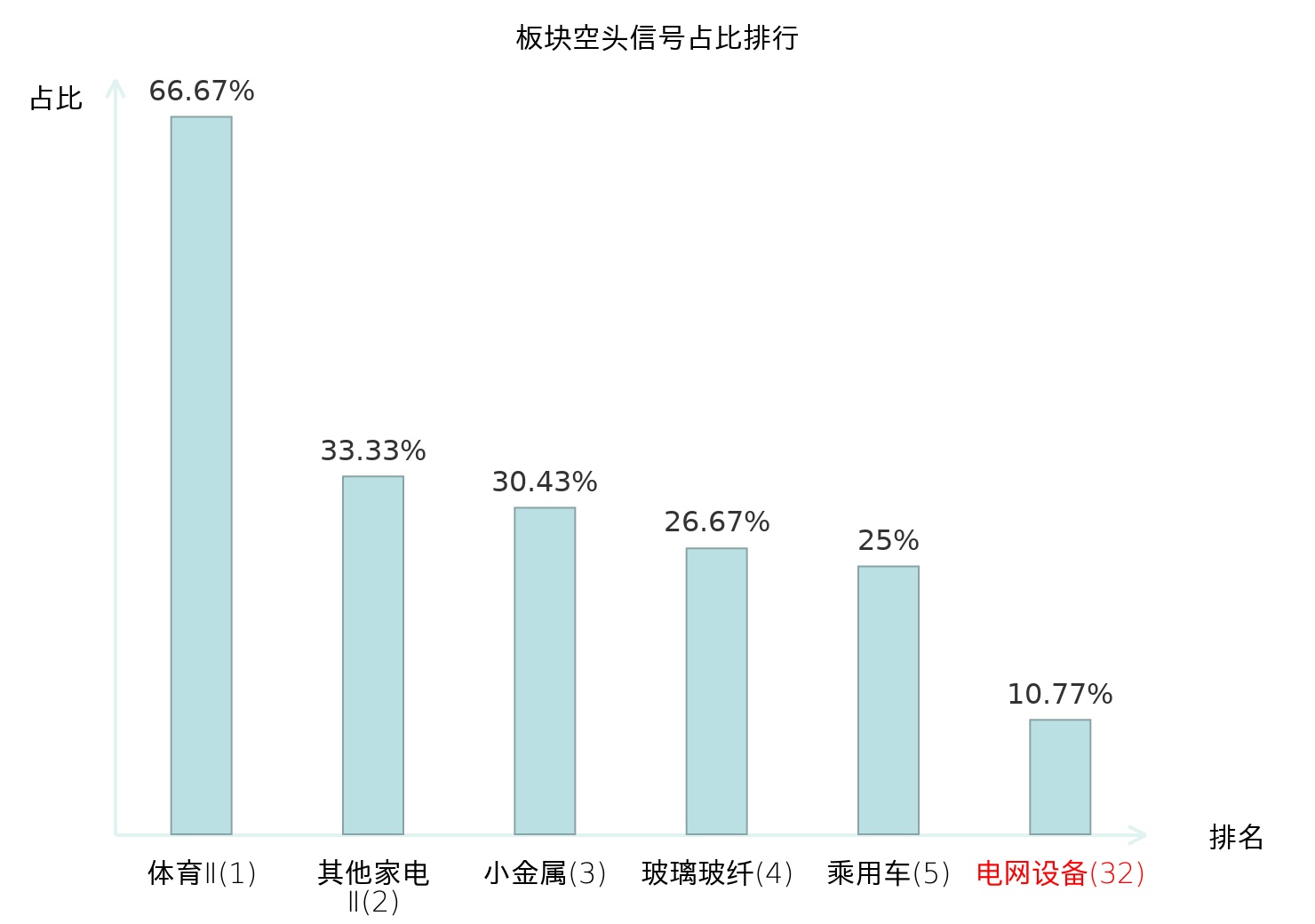 全市场所有行业板块中主力空头信号占比排名中,体育Ⅱ板块位居第一。光伏设备板块名次提升最快,较昨日上升113位。