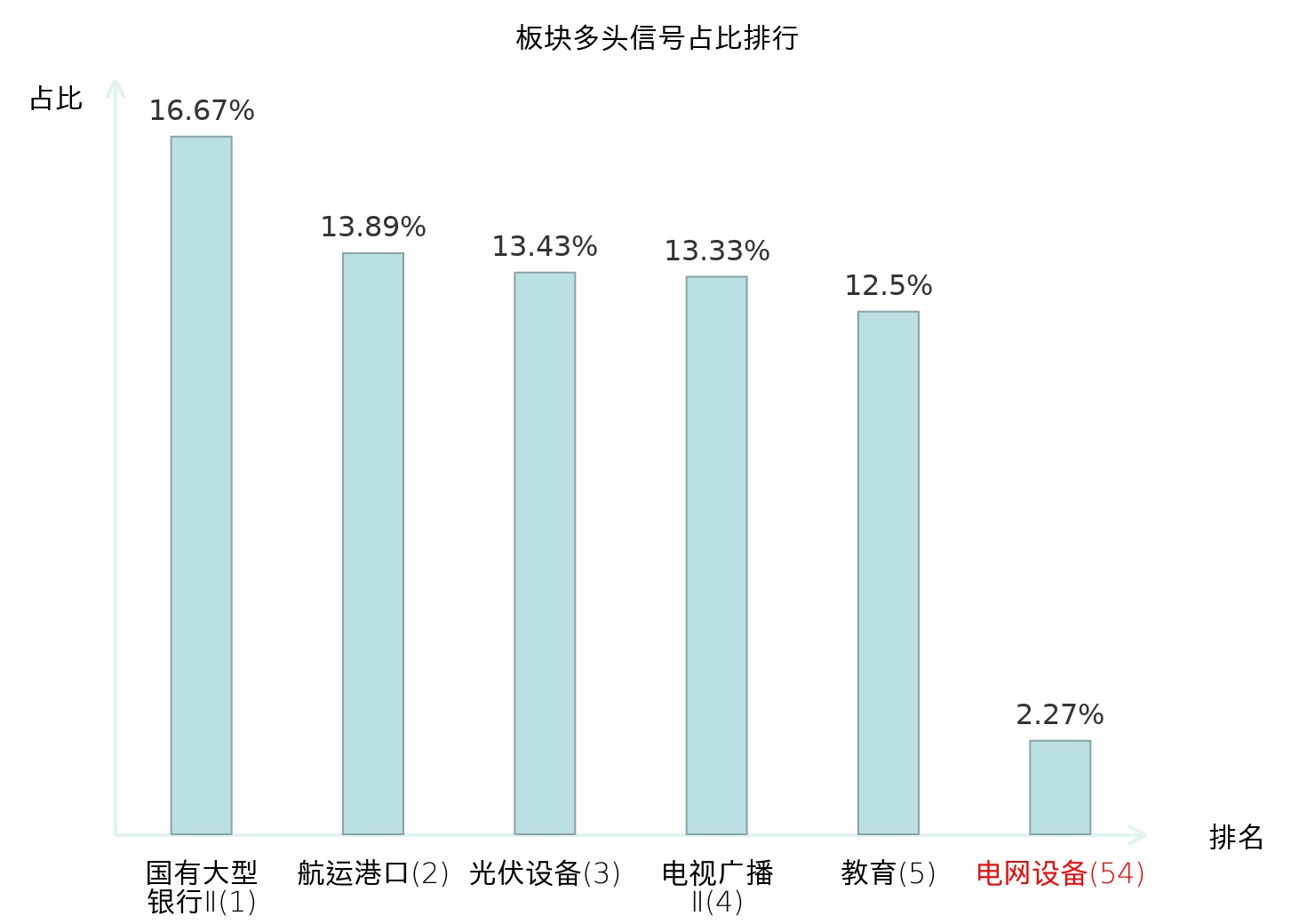 全市场所有行业板块中主力多头信号占比排名中,国有大型银行Ⅱ板块位居第一。国有大型银行Ⅱ板块名次提升最快,较昨日上升124位。