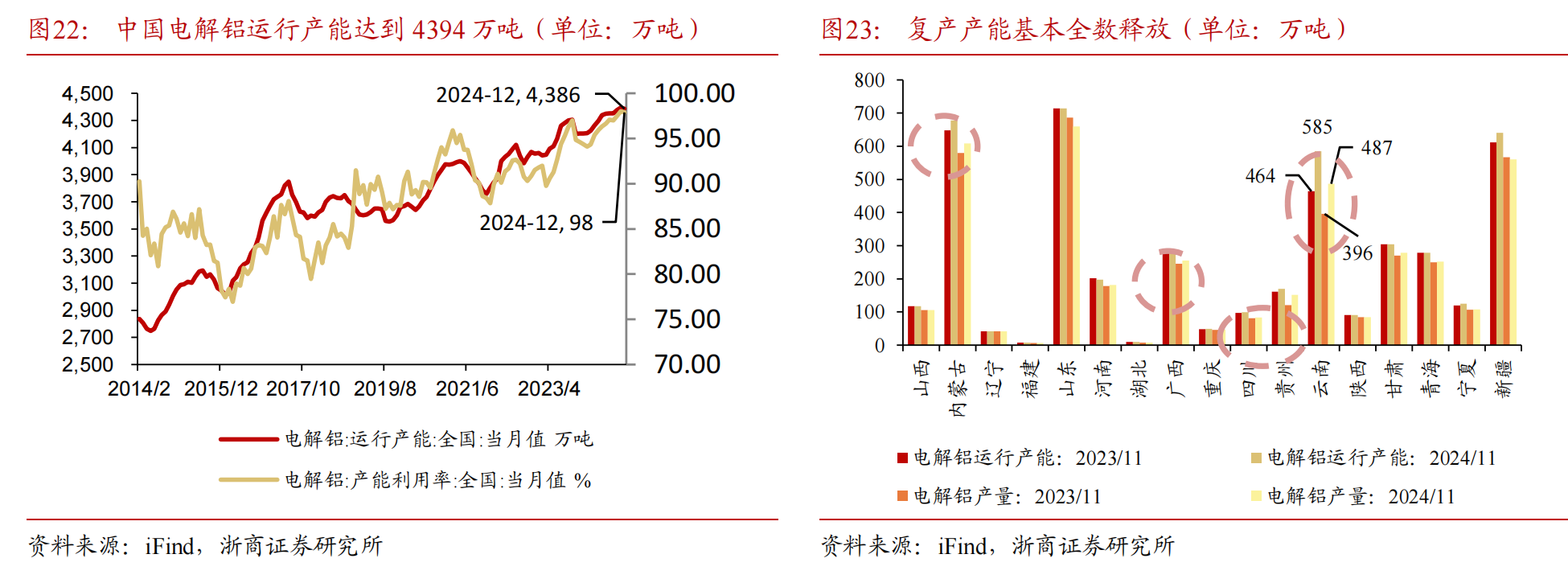 国内供给侧改革+节能降碳方案锁定产能红线,严限国内新增,国内后续新增产能仅限于目前少量指标投产2017年供给侧改革确定了4500万吨电解铝合规产能“天花板”,截止到2024年12月底,电解铝运行产能达到4386万吨,产能利用率提升至98%,无比接近产能天花板。