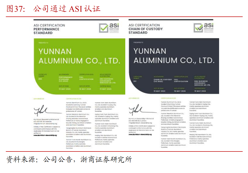 公司整合用电资源,以水电集中购买为主,2023年公司生产用电结构中绿电比例约80%,打造低碳/稳定经营的生命力。公司积极布局光伏直流电力,率先与国家电投云南国际联合开发成功光伏发电直流接入电解铝生产用电技术。随着全球产业链低碳要求趋严,碳交易以及碳关税的迅速推进,“绿色名片”对于电解铝的重要性逐步提升,公司已顺利获得ASI认证,进入全球ASI铝采购供应链。产业链要求目前为低碳要求推进的主要动力,后期将随着绿证市场/碳市场的成熟获得更多的市场活力。公司是首家通过最新实施的V3版ASI绩效(PS)标准认证的中国公司,也是目前中国唯一一家从铝土矿、氧化铝到电解铝、铝合金生产设施都通过ASI双认证的一体化铝业公司。云南电解铝低碳价值凸显。