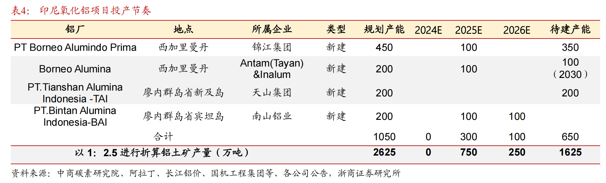 铝土矿减产影响被超预期消化,从氧化铝/铝土矿产能释放节奏来看,供需格局趋于缓解。我们预计氧化铝有效产量将于2025年底/2026年间出现集中放量,2024-2025Q1年间氧化铝格局保持紧平衡的可能性较高,后期随着几内亚铝土矿以及印尼氧化铝的投产放量,新一轮铝土矿全球布局完善后,格局趋于宽松,我们预计随着年内铝土矿&氧化铝项目的投产,价格回调到新一轮中枢。