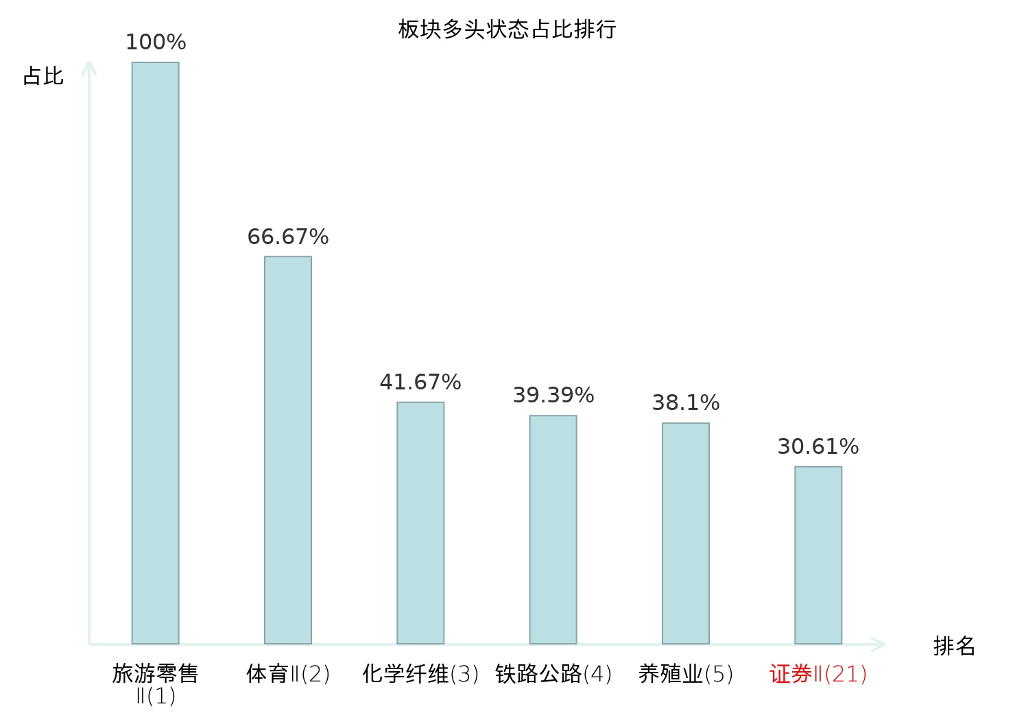 全市场所有行业板块中主力多头状态占比排名中,旅游零售Ⅱ板块位居第一。旅游零售Ⅱ板块名次提升最快,较昨日上升130位。