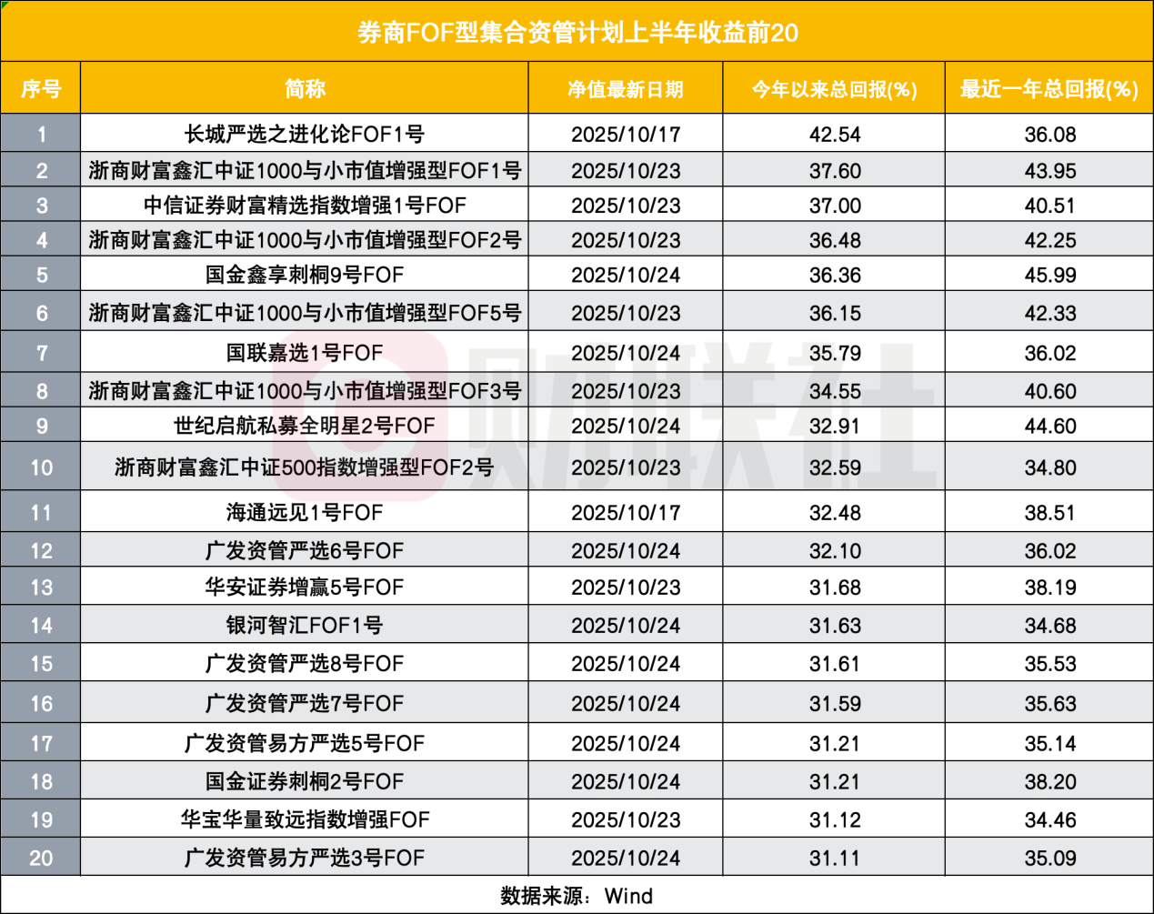 浙商证券共有浙商财富鑫汇中证1000与小市值增强型FOF1号、浙商财富鑫汇中证1000与小市值增强型FOF2号(36.48%)等5只产品进入前20,且均聚焦中证1000与小市值增强策略,体现出鲜明的产品特色。