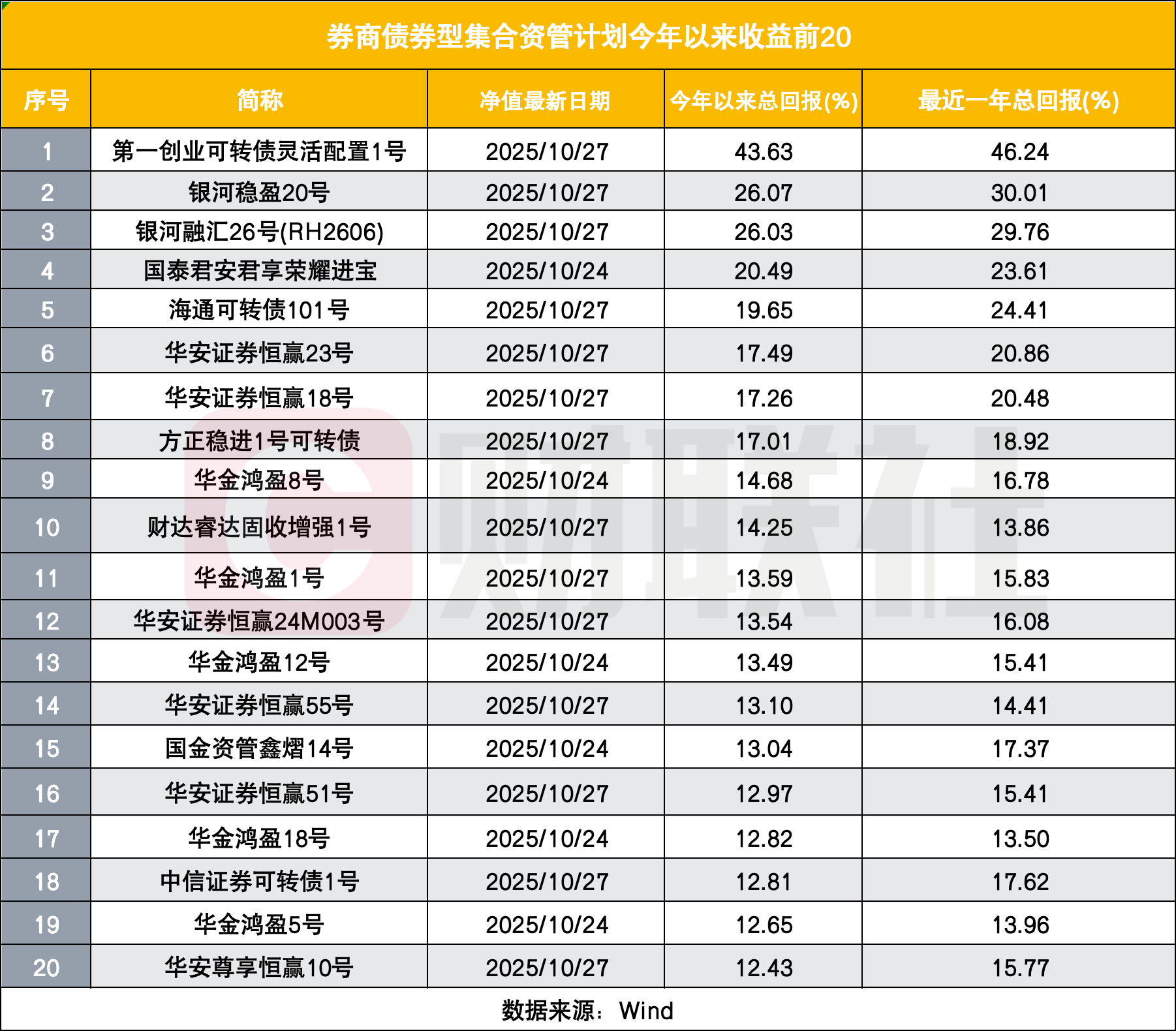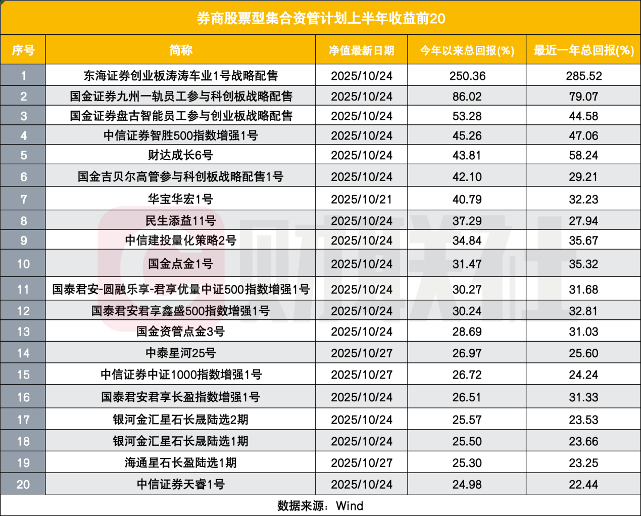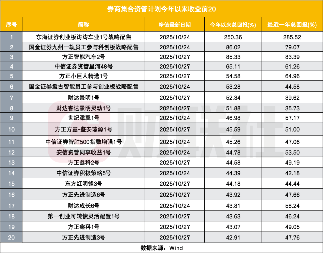 这一轮牛市中,券商资管各类型产品收益全面开花。从券商集合资管计划今年以来收益前20排名来看,产品收益差距显著,头部产品表现尤为亮眼。