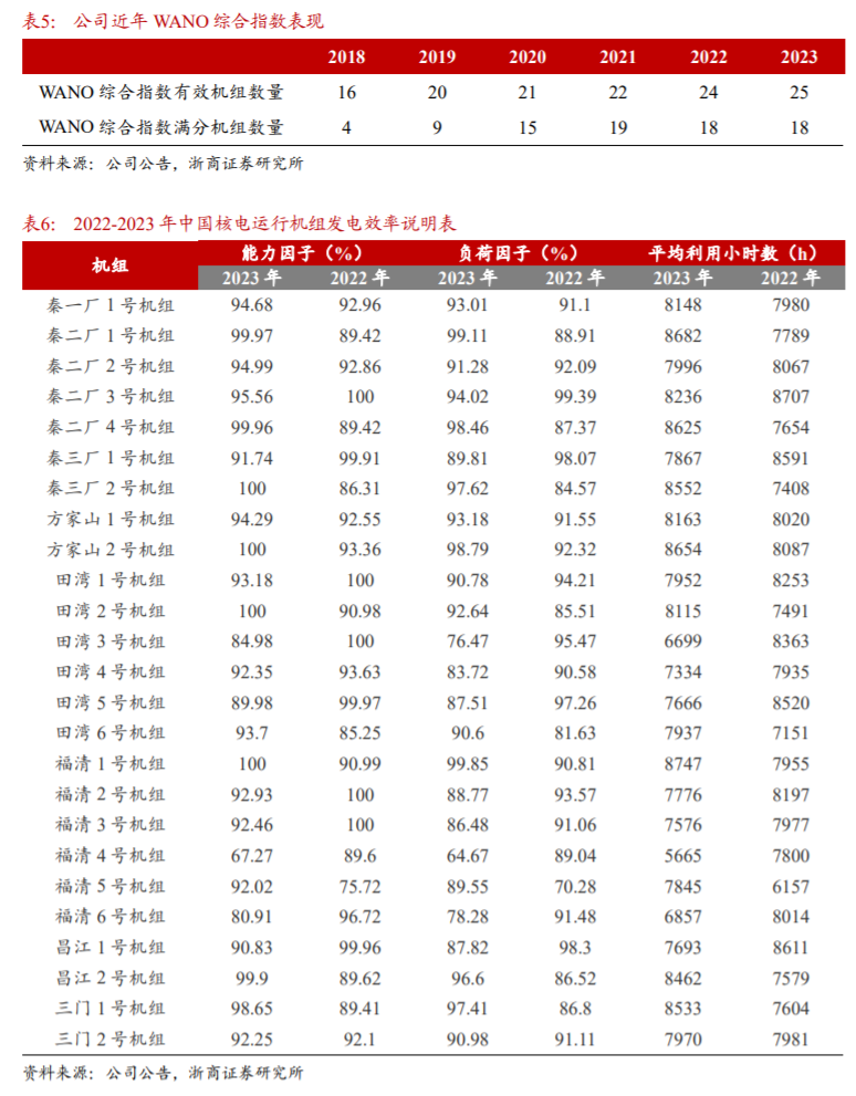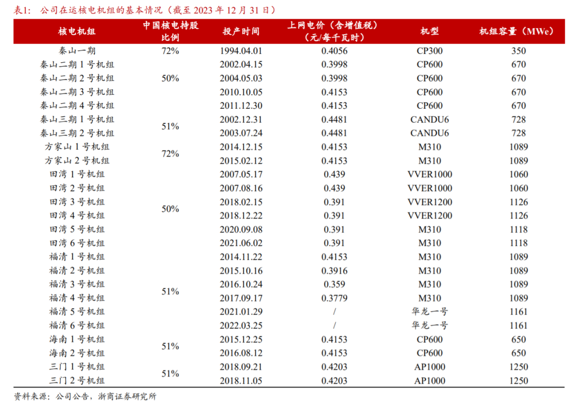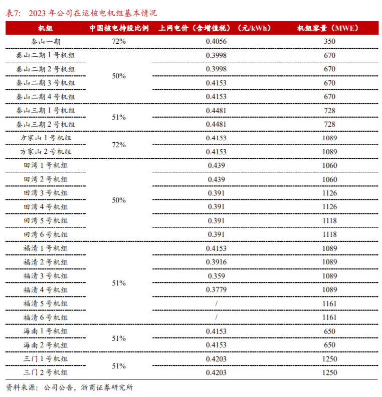 截至2024年上半年,公司核电控股在运装机容量2,375.00万千瓦,另有15台核准、在建核电机组;此外公司非核清洁能源在运在建装机突破3600万千瓦,在建新能源项目数量超过130个。当前公司沿海核电基地项目目前正在规划中,已经进入规划的有37个厂址,预计还能推动3~5个厂址纳入规划;未来公司有望保障每年4~6台机组具备核准条件,资源较为充足。近年来公司核电深入参与市场化交易,其核电2019年至2023年市场化交易电量占总上网电量比例由33.71%提高至42.65%,综合电价则保持稳定。公司近年来持续推进非核清洁能源开发工作,预计2025年新能源发电量将继续快速增加,与此同时公司立足核能综合利用,有序推进“核能+战略新兴产业”发展,研究探索新业态,积极发展核能供热、供汽等核能多用途利用以及同位素、钙钛矿等战略性新兴产业。
